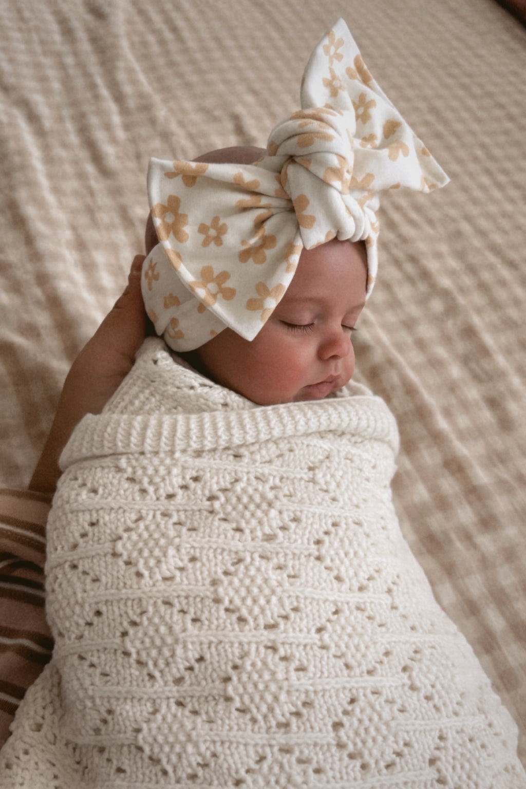 Wrap your little one in sweetness with this charming taN daisy tie-on headwrap. Designed with stretchy, adjustable fabric, it grows with your baby girl while keeping her comfortable all day long. The delicate daisy pattern adds a touch of whimsy to any outfit, making it perfect for photos, playdates, or everyday wear. Easy to secure and gentle on delicate skin.